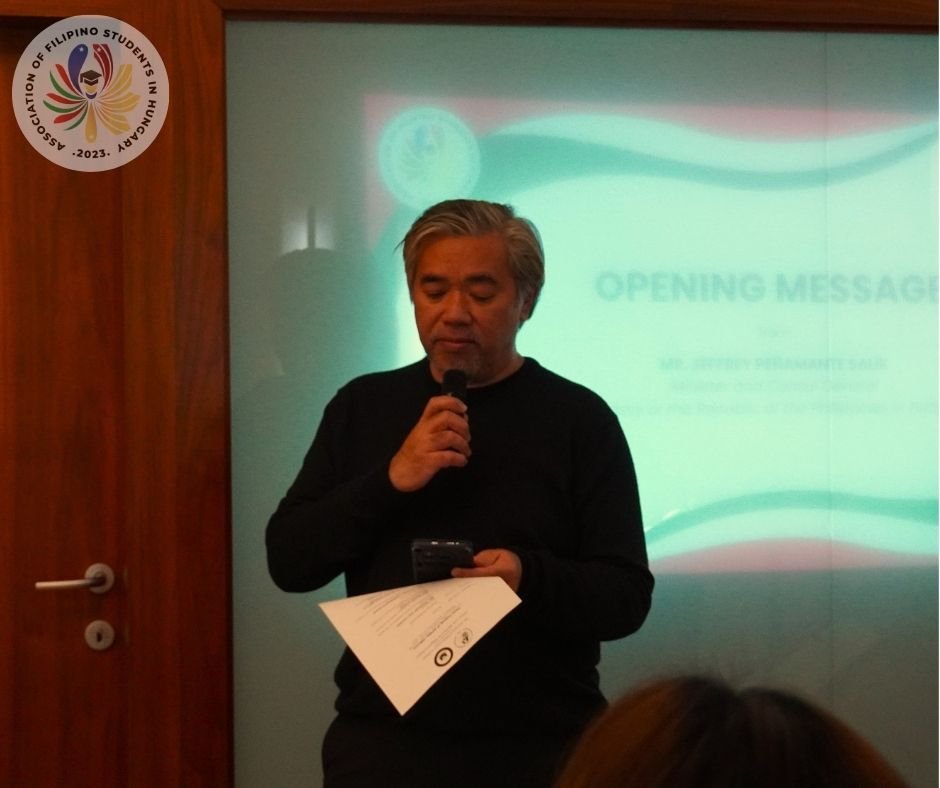 The ceremony opened with a message from Mr. Jeffrey Peñamante Salik, Minister and Consul General of the Embassy of the Republic of the Philippines in Hungary, who welcomed the new officers and highlighted the importance of leadership, responsibility, and unity among Filipino students abroad.
